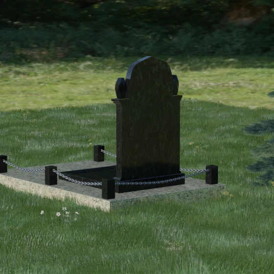 Особого внимания заслуживает безупречная зеркальная полировка. Глубокий блеск камня контрастирует с матовыми элементами и золотым тиснением знаков, создавая эффект торжественности. Вся композиция установлена на массивный гранитный цоколь, который полностью закрывает участок полированными плитами. Такое решение не только придает комплексу монументальный вид, но и практически исключает необходимость сложного ухода: на участке не будет сорняков и лишней влаги. Завершают ансамбль строгие столбики по периметру, соединенные декоративными цепями, что визуально очерчивает границы личного пространства и создает атмосферу уединения.
