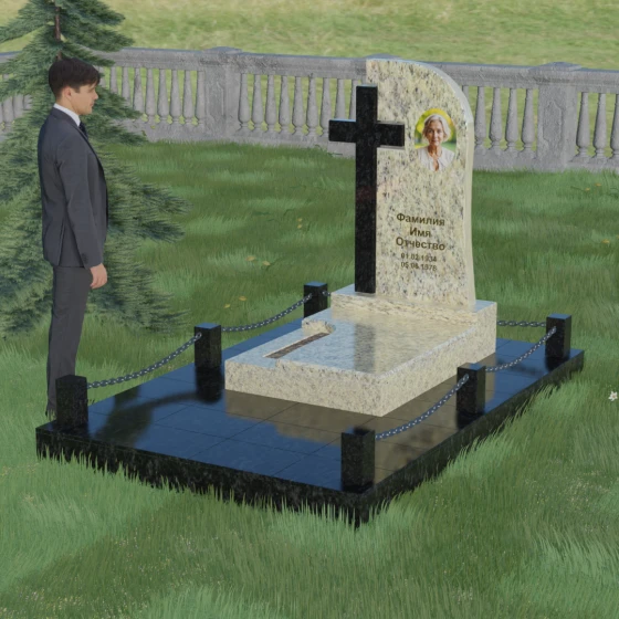 Правая часть стелы — это широкое каменное полотно с мягким, плавным изгибом в верхней части, напоминающим небесный свод или церковный купол. Контраст между прямолинейностью креста и текучестью основной плиты создает уникальный художественный ритм. Боковые грани и верхушка изделия отполированы до зеркального блеска, в котором отражается небо, в то время как глубокая гравировка текста и портрета в овальной нише подчеркивают индивидуальность монумента. Особую массивность конструкции придает основание — монумент возведен на высокий гранитный цоколь. По периметру установлены монументальные столбики с декоративными фасками, соединенные массивными цепями, что создает защищенный контур и атмосферу уединенного покоя.