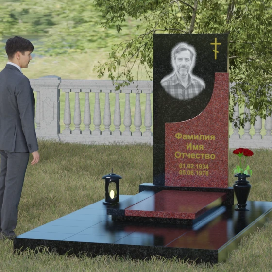 Модель Артикул 024 представляет собой законченное архитектурное решение. Стела установлена на массивный гранитный цоколь, который служит надежным фундаментом и придает всей конструкции необходимую устойчивость. Важной особенностью данного проекта является полное мощение участка: вместо открытого грунта используется сплошная надгробная плита. Это не только создает эстетически безупречный, аккуратный вид, но и значительно упрощает уход за местом захоронения, избавляя от необходимости борьбы с сорняками. В едином стиле с основным монументом выполнены дополнительные элементы декора: изящная каменная ваза, установленная на плите, позволяет приносить живые цветы, сохраняя гармонию композиции. Каменный бордюр по периметру участка четко очерчивает границы мемориала, превращая его в уединенное место для тихой молитвы и воспоминаний.