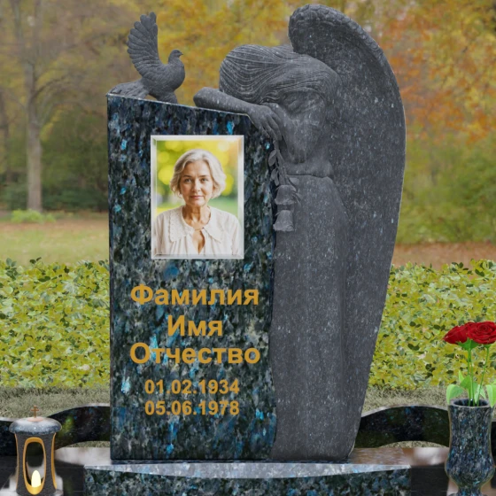 Верхний контур монумента украшен реалистичной фигуркой голубя, символизирующего чистоту души и мир. Композиция выстроена на игре фактур: идеально гладкий, иссиня-черный гранит отражает окружающий мир, в то время как резные элементы имеют благородную шероховатость, подчеркивающую природную суть материала. Форма стелы асимметрична, что придает всему комплексу динамику и современный вид в стиле модерн, сохраняя при этом торжественную монументальность.