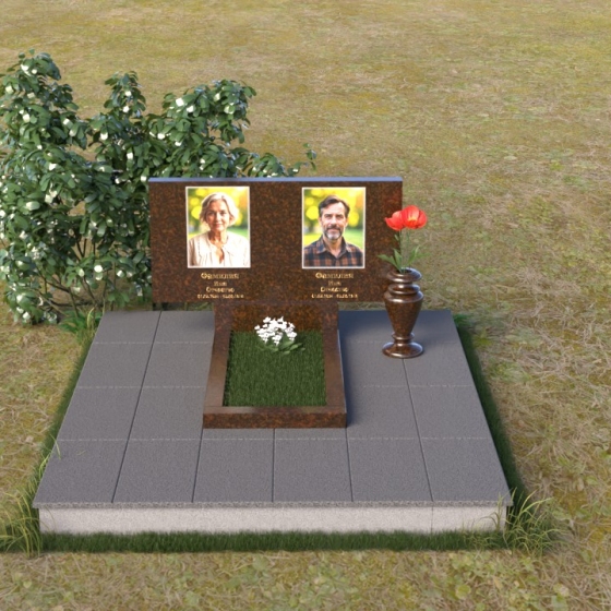 Представленный памятник (артикул ПГ001) являет собой образец строгости и лаконичности, где каждая деталь подчинена общей концепции увековечивания памяти. Композиция состоит из основания, облицованного серыми плитами, горизонтальной плиты, и вертикальной плиты с портретами. Дополнительно предусмотрена тумба для вазы.