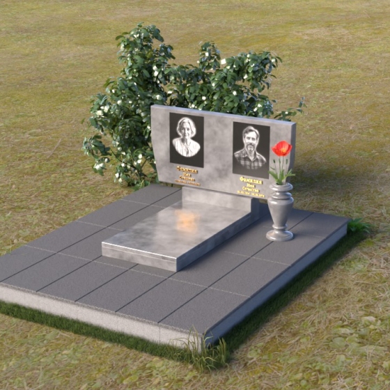 Это ритуальное изделие представляет собой гармоничное сочетание прямых линий и мягких, едва уловимых изгибов, создающих ощущение покоя и умиротворения. Стела имеет прямоугольную форму, но ее верхняя грань слегка скошена, что придает ей визуальную легкость и динамику. Обратите внимание на зеркальную полировку лицевой стороны – она отражает небо и окружающий мир, словно заключая в себе вечность. На полированной поверхности выгравированы портреты усопших и памятные надписи, выполненные с высокой точностью и детализацией. Слева от стелы, на основании, располагается небольшая горизонтальная плита с аналогичной полировкой, создающая дополнительное пространство для цветов или памятных предметов. Основание памятника выполнено из серого камня с матовой фактурой, что создает контраст с блестящей стелой и придает композиции устойчивость и завершенность. Рядом с плитой установлена ваза, выполненная из того же черного полированного гранита, что и стела, что обеспечивает единство стиля и служит достойным обрамлением для живых цветов, символизирующих вечную память.