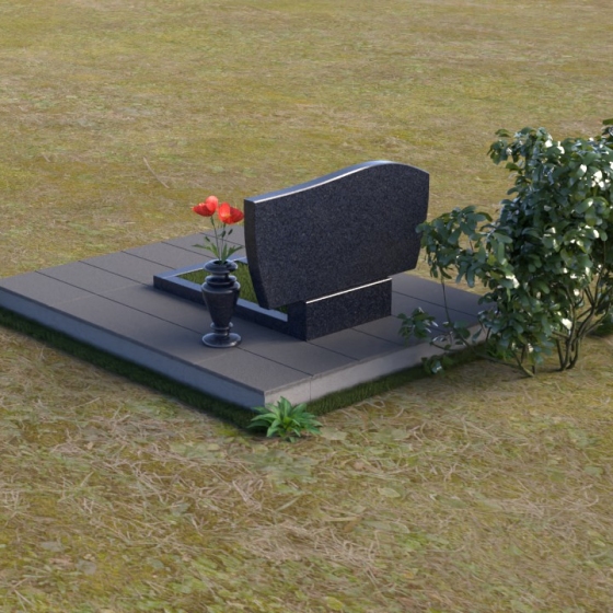 Форма стелы отличается лаконичностью, но при этом не лишена изысканности. Верхняя часть имеет мягкий, волнообразный изгиб, словно склоняясь в знак уважения и скорби. Прямоугольная подставка под стелой, выполненная в том же полированном граните, добавляет композиции завершенность и устойчивость. Дополнительная горизонтальная плита, расположенная на основании, создает пространство для возложения цветов и памятных вещей, позволяя выразить свою любовь и уважение.
