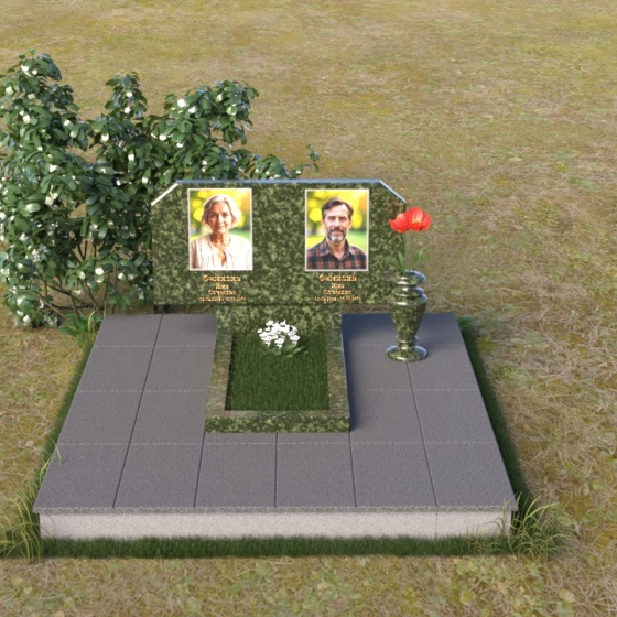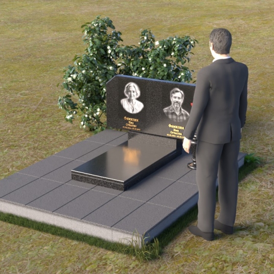 Форма стелы этого памятника предоставляет широкие возможности для оформления. Помимо портретов, на ней можно разместить эпитафии, религиозные символы или другие памятные надписи. Расположение портретов может быть как горизонтальным, как показано на изображении, так и вертикальным, в зависимости от ваших пожеланий. Важно помнить о гармоничном соотношении размеров портретов и остального текста, чтобы создать сбалансированную композицию. Гранитная подставка обеспечивает устойчивость всей конструкции и может быть дополнена цветником или другими элементами благоустройства. Черный цвет камня идеально сочетается с любыми оттенками цветов, поэтому вы можете смело экспериментировать с оформлением, создавая уникальный и запоминающийся образ. Ваза, входящая в комплект, предназначена для размещения живых или искусственных цветов. Она выполнена в строгом стиле и гармонично дополняет общую композицию памятника.