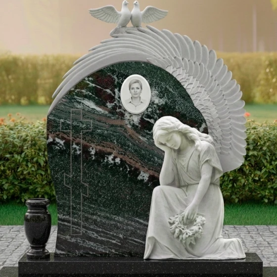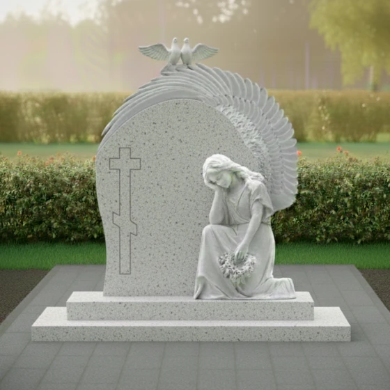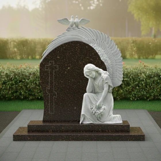 Гранитный монумент (Артикул: ПН 042) представляет собой глубокое художественное произведение, воплощающее вечную скорбь и светлую память. Его дизайн не просто отражает эстетику, но и погружает в мир символов, говорящих о любви, утрате и надежде. Центральный элемент композиции — это массивное вертикальное надгробие, выполненное в форме арки, словно обнимающей пространство памяти. Его левая грань обработана с идеальной полировкой, создающей зеркальную поверхность глубокого черного цвета, которая, словно бездонное зеркало, отражает мир, призывая к созерцанию. На этой полированной поверхности выгравирован лаконичный православный крест, чей строгий абрис с дополнительной нижней перекладиной, символизирующей подножие, и верхней короткой табличкой, выполнен в технике, которая позволяет ему слегка выступать над основной плоскостью, создавая эффект игры света и тени. Правая часть надгробия имеет плавный, волнообразный изгиб, переходящий в объемную резьбу, изображающую крыло. Каждое перо этого крыла вырезано с потрясающей детализацией, его матовая, светлая поверхность контрастирует с глубоким черным фоном, создавая ощущение легкости и невесомости. Эта игра контрастов — между блеском полированного гранита и матовой фактурой резьбы — придает монументу невероятный объем и глубину, заставляя его оживать под лучами света. Венчает композицию изящная скульптура, изображающая скорбящего ангела, преклонившего колени. Его фигура, выполненная из светлого камня, словно излучает внутренний свет, подчеркивая нежность и уязвимость. Голова ангела склонена, руки сложены на груди, в них он держит венок из цветов, каждый лепесток которых тщательно проработан, придавая венку реалистичный и трогательный вид. Над аркой, на ее вершине, расположены две белые голубки, символизирующие чистоту души и мир. Их фигуры выполнены в матовом светлом камне, что еще больше подчеркивает их символическое значение. Весь ансамбль покоится на двухступенчатом основании из черного полированного гранита, которое придает монументу устойчивость и завершенный вид. Контраст между матовыми элементами резьбы и блеском полированного камня создает удивительную игру света и тени, которая меняется в зависимости от освещения, придавая монументу динамичность и глубину. Это не просто памятник, это произведение искусства, которое говорит о вечных ценностях, о скорби и надежде, о памяти, которая живет в сердцах. Благоустройство участка выполнено с той же тщательностью и вниманием к деталям. Монумент установлен на массивный гранитный цоколь, придающий конструкции устойчивость и монументальность. Надгробная плита, выполненная в едином стиле со стелой, полностью покрывает пространство под памятником, создавая законченный и ухоженный вид, что значительно упрощает уход за местом захоронения. Отсутствие открытого грунта не только практично, но и эстетично, подчеркивая целостность композиции.