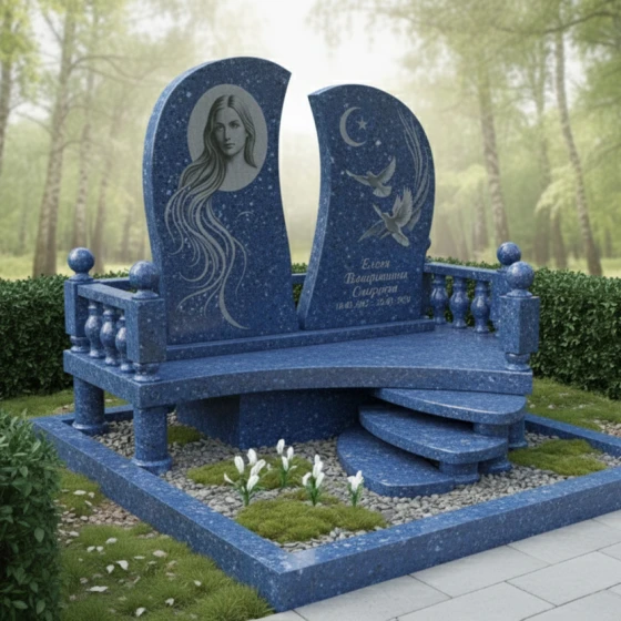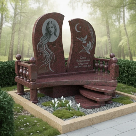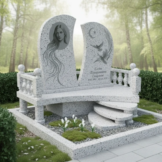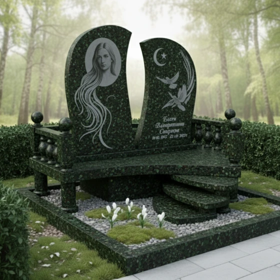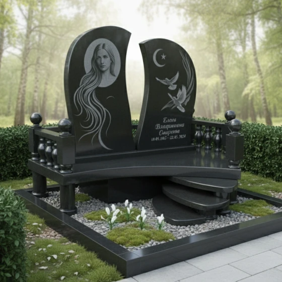 Мемориальная композиция ПН 063 представляет собой уникальное художественное произведение, где каждая линия и форма наполнены глубоким символизмом. Центральный элемент – две асимметричные стелы, словно раскрытые створки книги или два крыла, стремящиеся ввысь. Их плавные, волнообразные грани отполированы до зеркального блеска, создавая игру света и тени, подчеркивающую глубину черного гранита. Левая стела, более массивная и высокая, украшена гравировкой женского лика, выполненного с невероятной детализацией. Длинные, струящиеся волосы, обрамляющие лицо, создают ощущение легкости и воздушности, контрастируя с монументальностью камня. Правая стела, чуть ниже и изящнее, несет на себе изображения двух голубей, парящих на фоне полумесяца со звездой – символы чистоты, мира и духовного вознесения. Эти элементы выполнены с тончайшей проработкой деталей, где каждая перышко и изгиб крыла кажутся живыми, а матовая фактура гравировки эффектно выделяется на фоне глянцевой поверхности.