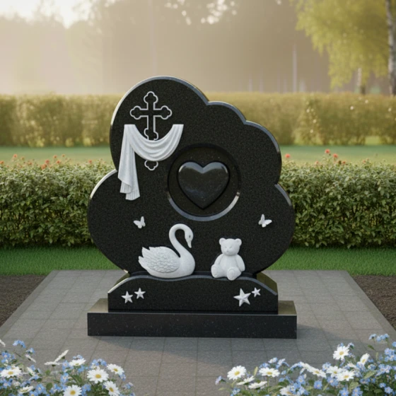 Форма этого мемориального комплекса глубоко символична. Плавные линии и мягкие очертания стелы олицетворяют покой и умиротворение, напоминая о тихой гавани, где душа находит вечный приют. Драпировка вокруг креста говорит о скорби, но одновременно и о защите, которую дарует вера. Сердце в центре – это не просто символ любви, а средоточие всех чувств, которые связывают нас с ушедшим. Лебедь и мишка, окруженные бабочками и звездами, создают образ невинности, чистоты и вечной нежности, напоминая о хрупкости жизни и красоте души. Этот памятник – это не прощание, а обещание помнить, любить и хранить светлый образ ушедшего человека в своем сердце навсегда.