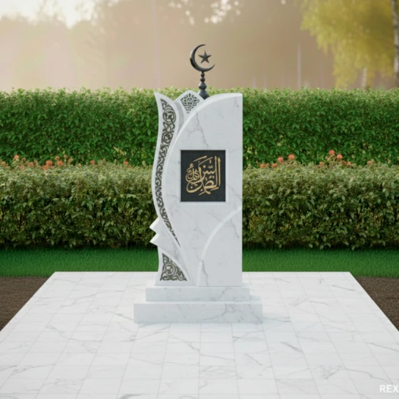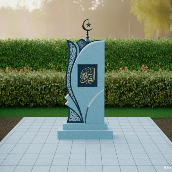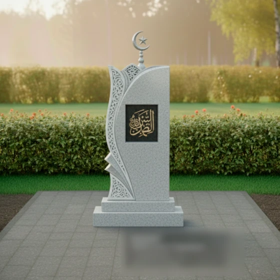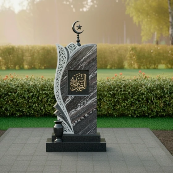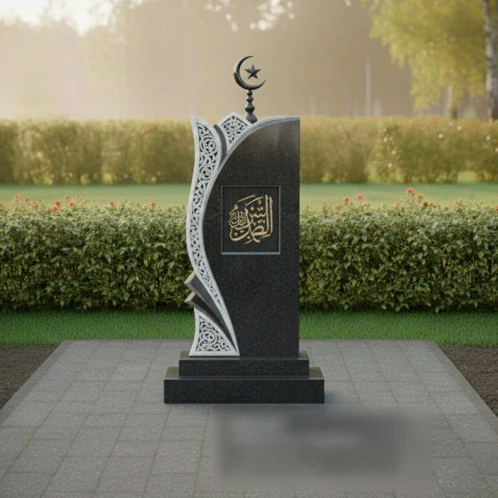 Левая сторона стелы украшена объемной резьбой, имитирующей изящный ажурный узор, который словно обнимает основную форму. Этот орнамент, напоминающий восточные мотивы, выполнен в светлом матовом срезе камня, что создает эффектный контраст с глубоким черным цветом полированной поверхности. Замысловатые переплетения линий и завитков вносят в композицию легкость и воздушность, символизируя нежность и утонченность души усопшего. В верхней части стелы возвышается исламский полумесяц со звездой, выполненный из темного металла, что подчеркивает религиозную принадлежность и придает монументу завершенность. В центральной части стелы, в рамке, расположена каллиграфическая надпись, предположительно из Корана, выполненная золотистым цветом, что символизирует духовную ценность и величие.