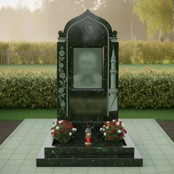 Особое внимание стоит уделить художественной резьбе, которая создает великолепный контраст с основной зеркальной поверхностью. На левой стороне фасада расположена вертикальная гирлянда из пяти распускающихся роз. Мастера детально проработали каждый лепесток: вы можете увидеть объемные изгибы бутонов и тонкие линии стеблей, которые словно оживают на холодном камне. Правая сторона украшена изображением стройного минарета — символа веры и стремления души ввысь. Венчают композицию искусно выгравированные полумесяц и звезда, выполненные в технике глубокой матовой гравировки, которая остается четкой даже спустя десятилетия под открытым небом.
