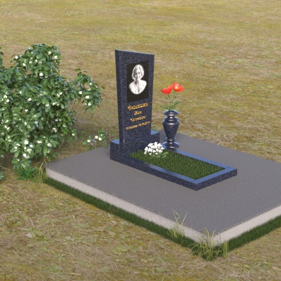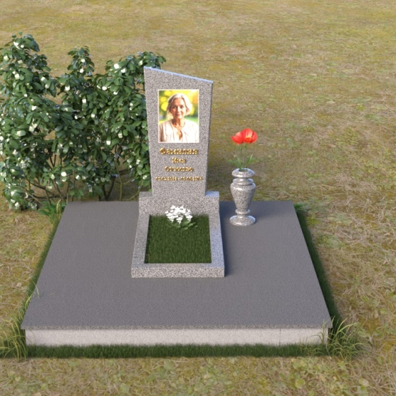 Мемориальная композиция состоит из нескольких элементов, каждый из которых тщательно продуман и выполнен с безупречным качеством. Начинается все с основания – широкой, массивной плиты, которая обеспечивает устойчивость всей конструкции. Её матовая, слегка шероховатая поверхность призвана оттенять блеск полированных элементов, создавая игру фактур и контрастов. Далее взгляд переходит к горизонтальной стеле, расположенной на постаменте. Она выполнена в виде прямоугольника с плавными, скругленными углами, что придает ей мягкость и элегантность. Поверхность стелы отполирована до зеркального блеска, отражая небо и окружающий мир, словно напоминая о связи между земным и небесным. На постаменте возвышается вертикальная стела с портретом и надписью. Верхняя часть стелы имеет скошенный угол, что добавляет динамики и оригинальности всей композиции. На стеле выгравированы имя, фамилия и отчество усопшего, а также даты жизни, выполненные изящным шрифтом. В правом углу композиции расположена ваза, предназначенная для цветов. Её классическая форма и полированная поверхность гармонично дополняют общий стиль мемориала.