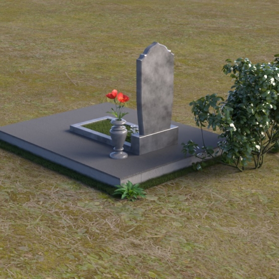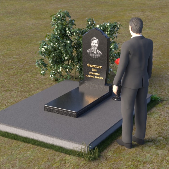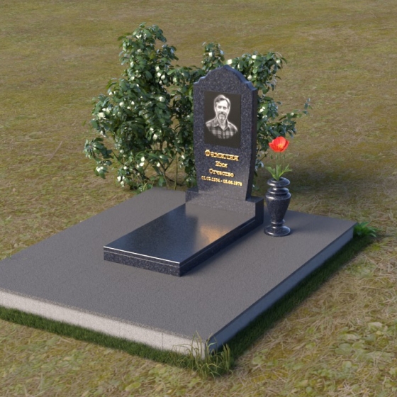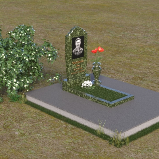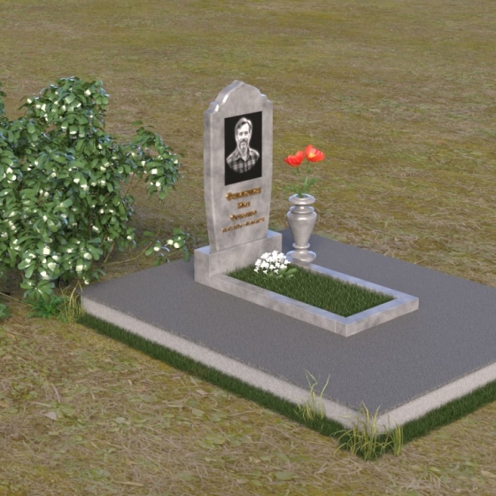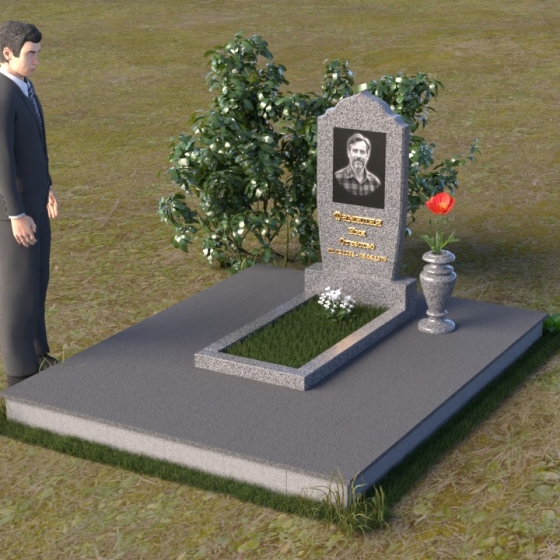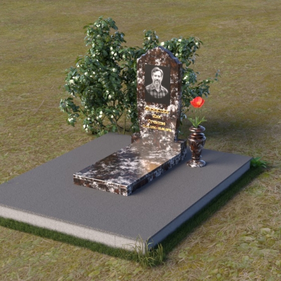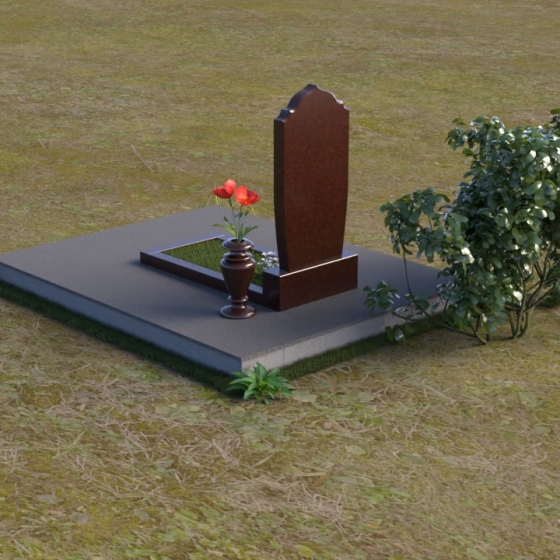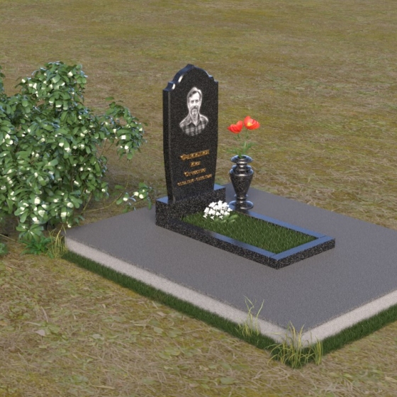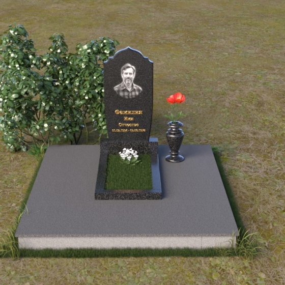 Надгробие из натурального камня ПВ 061 представляет собой элегантную композицию, сочетающую в себе строгость линий и плавные изгибы. Основная стела имеет форму, напоминающую стилизованную арку, с мягкими, скругленными плечами. Верхняя часть стелы украшена деликатными выемками, создающими эффект благородной старины. Боковые грани стелы тщательно отполированы, что придает памятнику законченный и респектабельный вид. Нижняя часть стелы переходит в прямоугольное основание, на которое устанавливается горизонтальная плита. Эта плита, выполненная в зеркальной полировке, отражает небо и окружающий ландшафт, создавая ощущение легкости и воздушности. Фаски на плитах аккуратно сняты, подчеркивая геометрию форм. Сбоку от основной стелы располагается небольшая ваза, выполненная в том же стиле и из того же материала, что и памятник. Ее изящная форма добавляет композиции завершенность и позволяет разместить живые цветы, символизирующие вечную память.