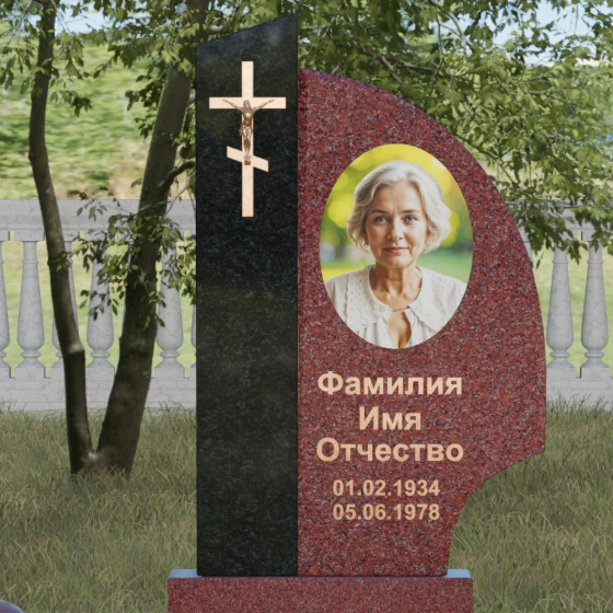 Оформление и советы искусствоведа: Для данной модели идеально подходит гравировка портрета в овальном или круглом формате, размещенная в верхней части «волнообразной» стелы. Это уравновешивает массивность левой части с крестом. Текст (ФИО и даты) рекомендуется выполнять глубоким академическим шрифтом с последующим покрытием сусальным золотом или «под бронзу», чтобы поддержать цветовую гамму распятия. Зеркальная полировка камня обеспечит четкость гравировки, которая не потускнеет и через сто лет, требуя лишь минимального ухода — протирки мягкой ветошью.