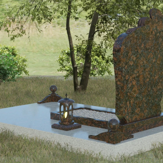 Благоустройство участка выполнено с учетом канонов высокой эстетики и практичности. Основной массив установлен на массивный гранитный цоколь, подчеркивающий надежность всей конструкции. Периметр участка очерчен строгим каменным бордюром, на углах которого возвышаются полированные шары — символы совершенства и завершенности жизненного цикла. Открытый цветник заменен на элегантную надгробную плиту с декоративной отсыпкой из светлой гальки, что не только создает законченный вид, но и значительно упрощает уход за местом памяти. Дополняют ансамбль изящная гранитная ваза для живых цветов и закрытая лампада, чей свет будет защищен камнем в любые непогоды.