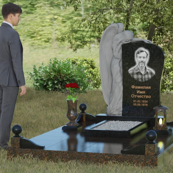 Форма этого надгробия лишена агрессивных острых углов в верхней части, что придает ему мягкость и одухотворенность. Асимметричная верхушка основного массива плавно огибает фигуру ангела, создавая ощущение защиты и покровительства. С точки зрения символизма, ангел здесь выступает не только как страж души, но и как медиатор между мирами, разделяющий горечь утраты с живыми. Каменные шары на столбиках ограждения отсылают к вечности и бесконечности бытия. Массивность основания и использование цельных плит для мощения участка олицетворяют устойчивость памяти, которую не в силах разрушить ни ветры, ни дожди.