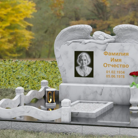 Представленный мемориальный комплекс (Артикул 130) является подлинным шедевром современной ритуальной архитектуры. Это не просто знак памяти, а монументальное художественное произведение, в котором гармонично сплелись суровая прочность природного камня и хрупкая нежность скульптурной пластики. Центральное место в композиции занимает величественная стела, выполненная в уникальном комбинированном стиле. Глубокий, антрацитово-черный массив основной плиты с безупречной зеркальной полировкой служит идеальным холстом для мемориальной гравировки. Его обрамляет искусно вырезанная из светлого камня фигура скорбящего ангела. Мастер добился поразительной детализации: вы можете видеть каждое перышко на мощных, распростертых крыльях, которые словно защищают покой ушедшего человека. Контраст между матовой, фактурной поверхностью резных элементов и глянцевым блеском основного камня создает невероятную визуальную глубину.