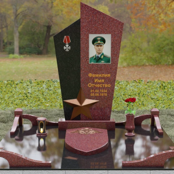 Данная мемориальная композиция представляет собой воплощение архитектурной эстетики и глубокого символизма. Выбор этой модели продиктован её уникальной асимметричной формой, которая отходит от классических канонов в сторону современного монументального искусства. Стела состоит из двух сопряженных сегментов, выполненных в контрастной цветовой гамме, что позволяет подчеркнуть многогранность личности усопшего. Левая часть, обладающая выраженной фактурой натурального камня, служит идеальным фоном для размещения наградной символики, в то время как правая — глубоко черная, зеркально отполированная панель — предназначена для основного портрета и памятных надписей.