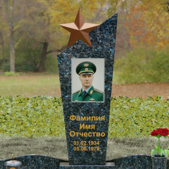 Основу композиции составляет массивное каменное полотно с уникальной асимметричной геометрией. Верхний край обелиска уходит в резкий диагональный подъем, создавая динамичный силуэт, устремленный к небесам. Венчает эту вершину объемная пятиконечная звезда — символ, выполненный в теплом бронзовом оттенке, который эффектно контрастирует с основным цветом камня. Зеркальная полировка лицевой грани доведена до эталонного блеска: поверхность буквально оживает, отражая окружающий мир и создавая глубину, в которой запечатлен портрет. Прямые, строгие линии боковых граней подчеркнуты аккуратными фасками, что придает всей конструкции архитектурную завершенность и визуальную легкость при сохранении колоссальной физической прочности.