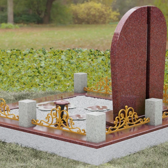 Данная модель предполагает целостное оформление места захоронения, превращая его в гармоничный архитектурный ансамбль. Основанием служит мощный гранитный цоколь, который не только обеспечивает устойчивость всей конструкции, но и четко очерчивает границы участка. По периметру установлены массивные каменные столбики, соединенные декоративным кованым ограждением, что создает атмосферу уединения и защищенности. В едином стиле с основным памятником выполнена надгробная плита и подставка, на которой размещаются дополнительные аксессуары: изящная каменная ваза для живых цветов и закрытая лампада из темного гранита, в которой будет теплиться огонек вечной памяти. Такое решение значительно упрощает уход за участком, сохраняя его аккуратный и достойный вид на долгие годы.