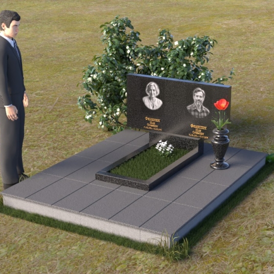 Представленный памятник (артикул ПГ001) являет собой образец строгости и лаконичности, где каждая деталь подчинена общей концепции увековечивания памяти. Композиция состоит из основания, облицованного серыми плитами, горизонтальной плиты, и вертикальной плиты с портретами. Дополнительно предусмотрена тумба для вазы.