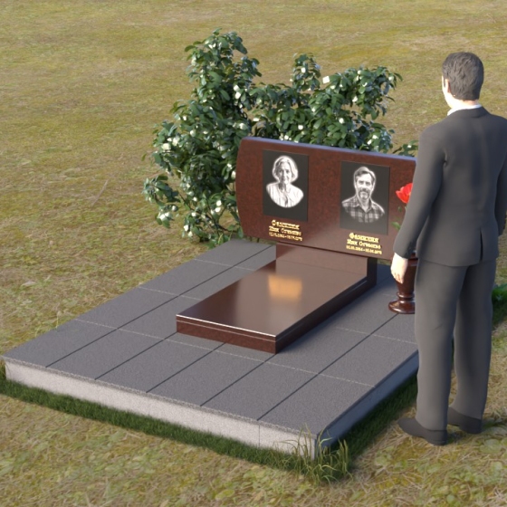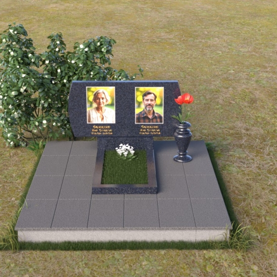 Композиция памятника строится на контрасте строгих геометрических форм и плавных линий, создавая гармоничный и запоминающийся образ. В верхней части возвышается стела из черного гранита, чья зеркальная полировка отражает небо и окружающий мир, словно напоминая о связи земного и небесного. Верхние углы стелы скруглены, смягчая строгость формы и придавая ей более мягкий, человечный облик. На стеле размещены портреты усопших, выполненные с высокой точностью и передающие их индивидуальность. Золотистые надписи имен и дат словно светятся на фоне черного камня, добавляя торжественности и значимости. У подножия стелы располагается горизонтальная плита, также выполненная из полированного черного гранита, создающая ощущение завершенности и устойчивости. Рядом – изящная ваза из того же материала, предназначенная для живых цветов, символа неувядающей памяти и любви.