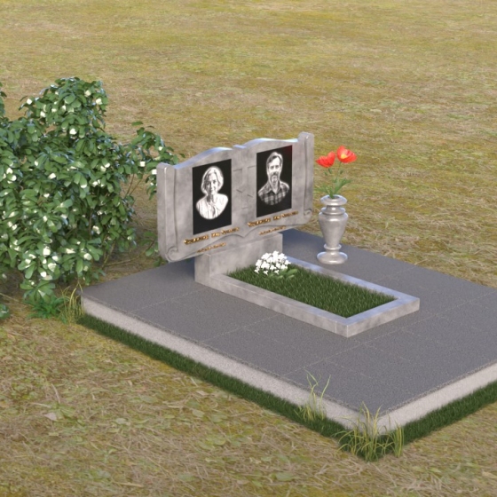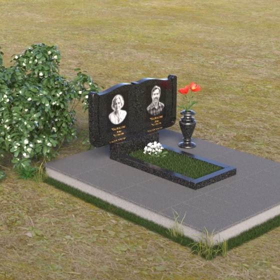 Ритуальное изделие ПГ036 представляет собой сдержанную, но исполненную достоинства композицию, созданную для сохранения памяти о близких. Два прямоугольных элемента стелы, соединенные вместе, образуют волнистый верх, напоминающий раскрытую книгу судеб. Грани обеих частей искусно обработаны, создавая мягкий, обтекаемый силуэт. Зеркальная полировка черного гранита служит идеальным фоном для гравировки портретов и надписей, словно запечатлевая светлые воспоминания в вечном камне. Слева и справа, в верхней части стелы, вырезаны лаконичные кресты, символизирующие веру и надежду. Тонкие линии врезаются в полированную поверхность, создавая игру света и тени, и добавляя глубину изображению. Горизонтальная плита, расположенная перед стелой, выполнена из того же черного гранита с зеркальной полировкой, отражая небо и окружающий пейзаж, создавая ощущение легкости и воздушности. Вместе с тем, основание памятника выполнено из серого камня, что придает всей композиции устойчивость и основательность.