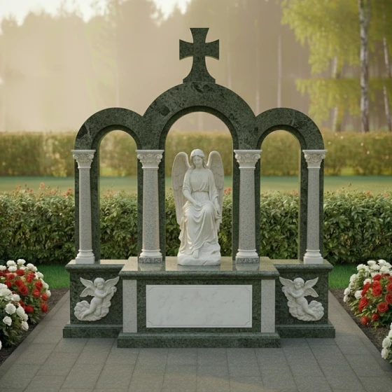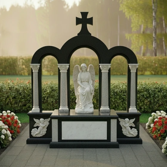 Кому подойдет: Эта мемориальная композиция идеально подойдет для тех, кто ищет не просто надгробный знак, а настоящее произведение мемориального искусства, способное выразить глубокую скорбь и вечную любовь. Она станет достойным воплощением памяти о человеке, чья жизнь была наполнена светом, верой и достоинством. Величественная аркада, символизирующая переход в иной мир, и фигура ангела, олицетворяющая чистоту души, делают эту композицию идеальным выбором для увековечения памяти о близком человеке, чья жизнь оставила неизгладимый след. Мемориальная композиция ПН 044 доступна для заказа в 8 цветовых решениях, что позволяет подобрать материал, наиболее точно отражающий характер и индивидуальность усопшего. Вы можете выбрать один из семи видов гранита: гранит Амфиболит с его глубоким черным цветом, величественный Балтик Грин, благородный Блю Перл, классический Габбро-диабаз, теплый Дымовский, изысканный Лезниковский или светлый Мансуровский. Также доступен мрамор Тассо, который придаст композиции особую нежность и утонченность. Такой широкий выбор материалов дает возможность создать по-настоящему уникальный и персонализированный мемориал, созвучный духу и памяти усопшего.