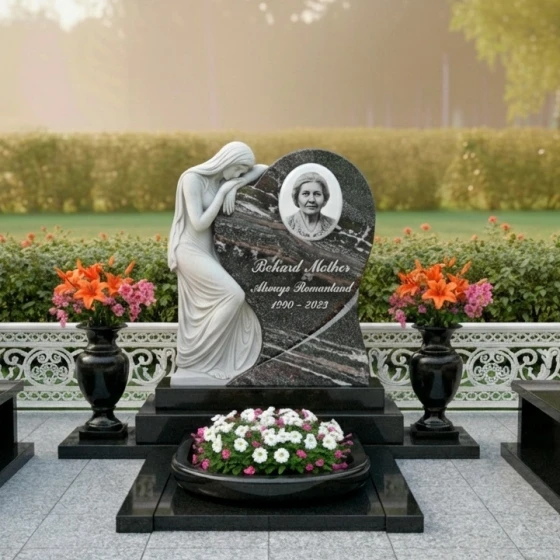 Форма этой мемориальной композиции предоставляет широкие возможности для индивидуального оформления. Сердцевидная часть стелы идеально подходит для размещения портрета усопшего. Овальное обрамление, в которое вписан образ, создает ощущение завершенности и фокуса, при этом не перегружая композицию. Под портретом достаточно места для выгравированной эпитафии, дат жизни, или символических изображений, которые дополнят историю. Благодаря гладкой, полированной поверхности, гравировка будет выглядеть четко и выразительно, а светлые матовые элементы резьбы внесут дополнительный контраст и объем. Эта форма стелы позволяет экспериментировать с различными стилями гравировки – от классических портретов до художественных изображений, которые подчеркнут уникальность личности. Возможно также нанесение на обратную сторону стелы дополнительных символов или памятных надписей, сохраняя при этом общую гармонию и элегантность комплекса.