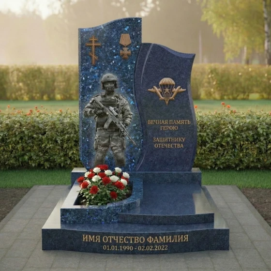 Правая стела, немного ниже и уже левой, имеет более динамичную, волнообразную форму. Ее верхняя часть плавно изгибается, создавая ощущение движения и легкости, несмотря на массивность камня. Лицевая сторона этой стелы также тщательно отполирована. В верхней части выгравирован символ Воздушно-десантных войск — парашют с крыльями, выполненный в золотистом цвете, что придает ему особую выразительность и значимость. Под ним располагаются проникновенные слова: "ВЕЧНАЯ ПАМЯТЬ ГЕРОЮ ЗАЩИТНИКУ ОТЕЧЕСТВА", выгравированные четким шрифтом, которые служат данью уважения и признательности. Боковые грани обеих стел имеют нежную, полуполированную обработку, которая мягко переходит в идеально отполированную лицевую часть, подчеркивая природную красоту камня и мастерство его обработки.