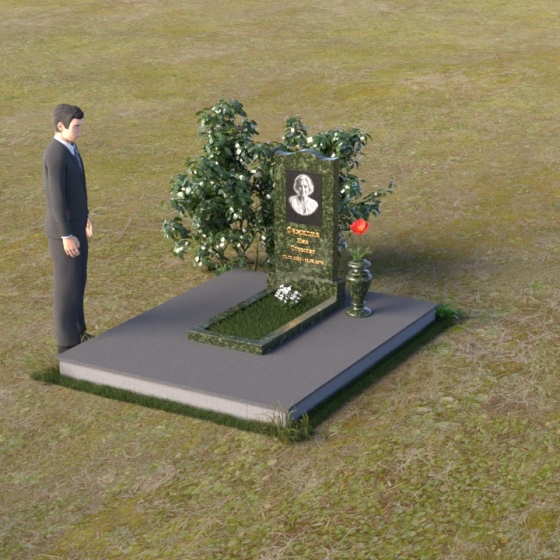 Величественная стела памятника ПВ 008 представляет собой элегантное сочетание строгих линий и плавных изгибов. Верхняя часть стелы имеет волнообразную форму, смягчающую строгость камня и придающую ей утонченность. Грани стелы тщательно отполированы до зеркального блеска, отражая свет и создавая ощущение легкости и воздушности. На лицевой стороне стелы размещен портрет усопшего, выполненный методом гравировки. Ниже располагаются надпись с именем и датами жизни. Под стелой расположена горизонтальная плита, также выполненная из полированного гранита. Ее строгие прямоугольные формы контрастируют с плавными линиями стелы, подчеркивая ее выразительность. Фаски по периметру плиты смягчают углы и придают ей завершенный вид. Рядом со стелой установлена небольшая ваза из темного гранита с изящным орнаментом, предназначенная для живых цветов.