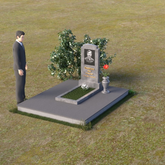 Основной акцент в этой модели сделан на контрасте фактур. Зеркальная полировка черного гранита Габбро-диабаз, из которого выполнена стела, создает эффект бесконечности, отражая небо и окружающий мир. На этом фоне особенно выразительно смотрится гравировка портрета и надписи, выполненные с ювелирной точностью. Нижняя часть стелы, переходящая в горизонтальную плиту, также выполнена из черного гранита, но уже с матовой обработкой, что придает композиции дополнительную глубину и текстуру. Рядом располагается ваза из того же гранита, выполненная в классическом стиле, предназначенная для живых цветов, которые станут символом памяти и любви.