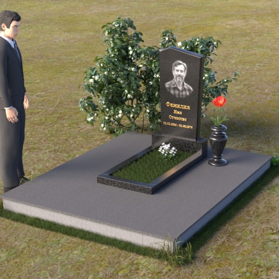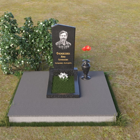 Этот гранитный монумент представляет собой композицию из двух основных элементов: вертикальной плиты с портретом и горизонтальной накладки. Вертикальная плита, возвышающаяся над землей, имеет строгую прямоугольную форму с небольшим скосом в верхней части. Это придает монументу сдержанную элегантность. Зеркальная полировка поверхности отражает свет, создавая ощущение глубины и сияния. На плите выгравирован портрет усопшего, выполненный с высокой точностью и вниманием к деталям. Ниже портрета располагается надпись с именем и датами жизни, выполненная золотым шрифтом. Горизонтальная накладка, расположенная в нижней части, также выполнена из черного полированного гранита и служит своеобразным пьедесталом для вертикальной плиты. Ее гладкая поверхность создает дополнительный контраст с окружающей средой. Рядом с монументом установлена ваза из черного гранита, предназначенная для живых цветов.