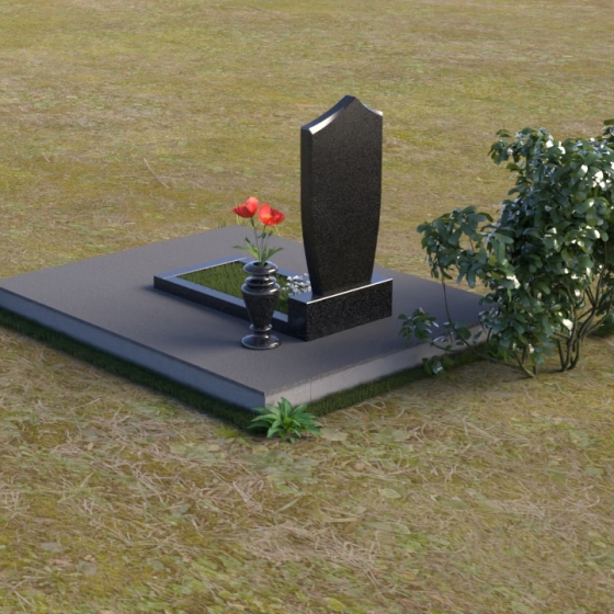 Особое внимание привлекает подставка под стелу, выполненная в том же стиле и материале. Она служит надежным основанием и визуально объединяет композицию. Рядом располагается прямоугольная надгробная плита с идеально отполированной поверхностью, способной выдержать любые погодные условия, сохраняя свой первозданный блеск на долгие годы. На этой гладкой поверхности можно разместить эпитафию, слова любви и скорби, которые будут вечно напоминать о дорогом человеке. Контраст между черным глянцем полировки и светло-серым цветом основания создает гармоничный и сдержанный образ, полный достоинства и уважения.